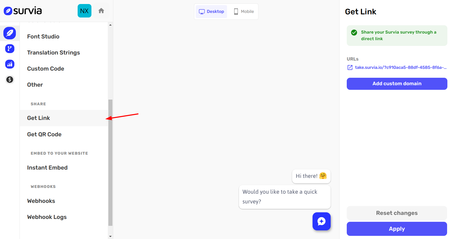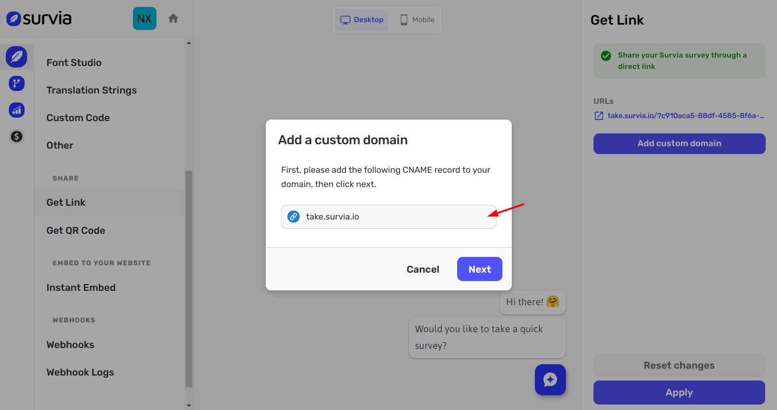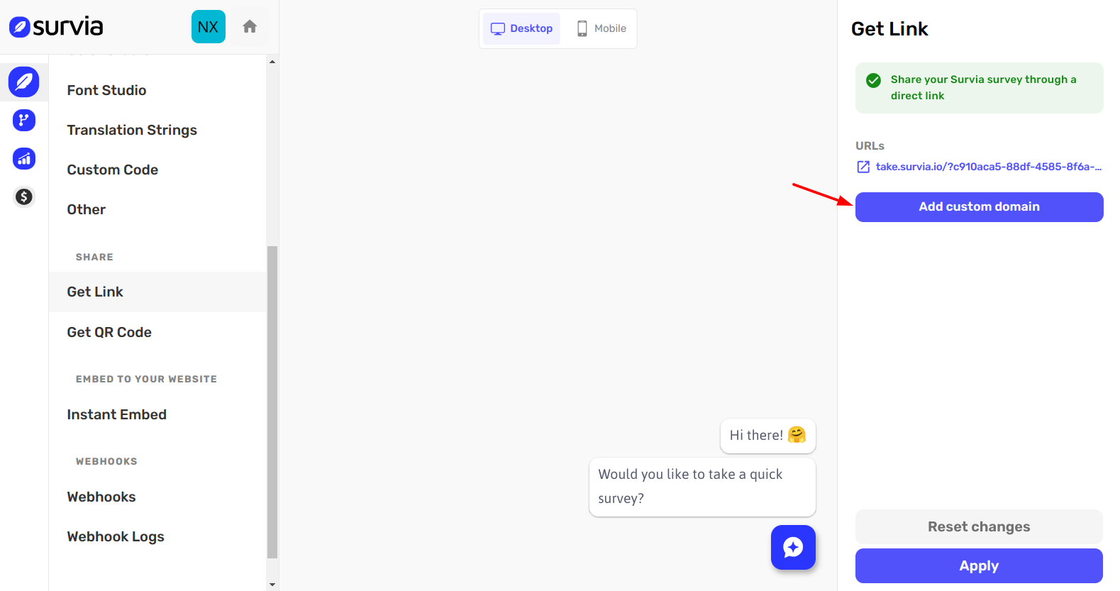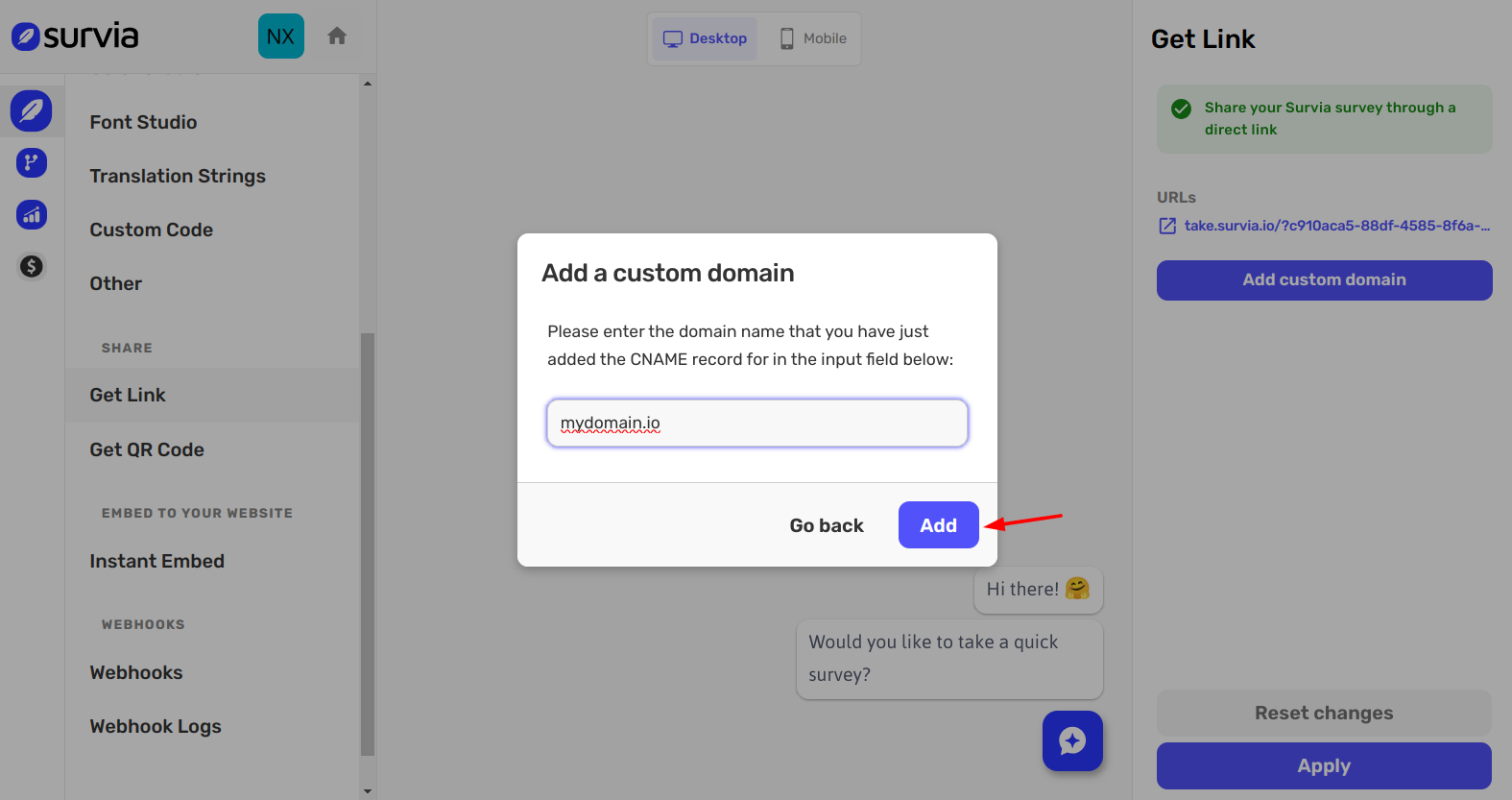 Go to the Get Link page for your survey. Here, you'll see your automatically generated link as well as an option to add a custom domain.